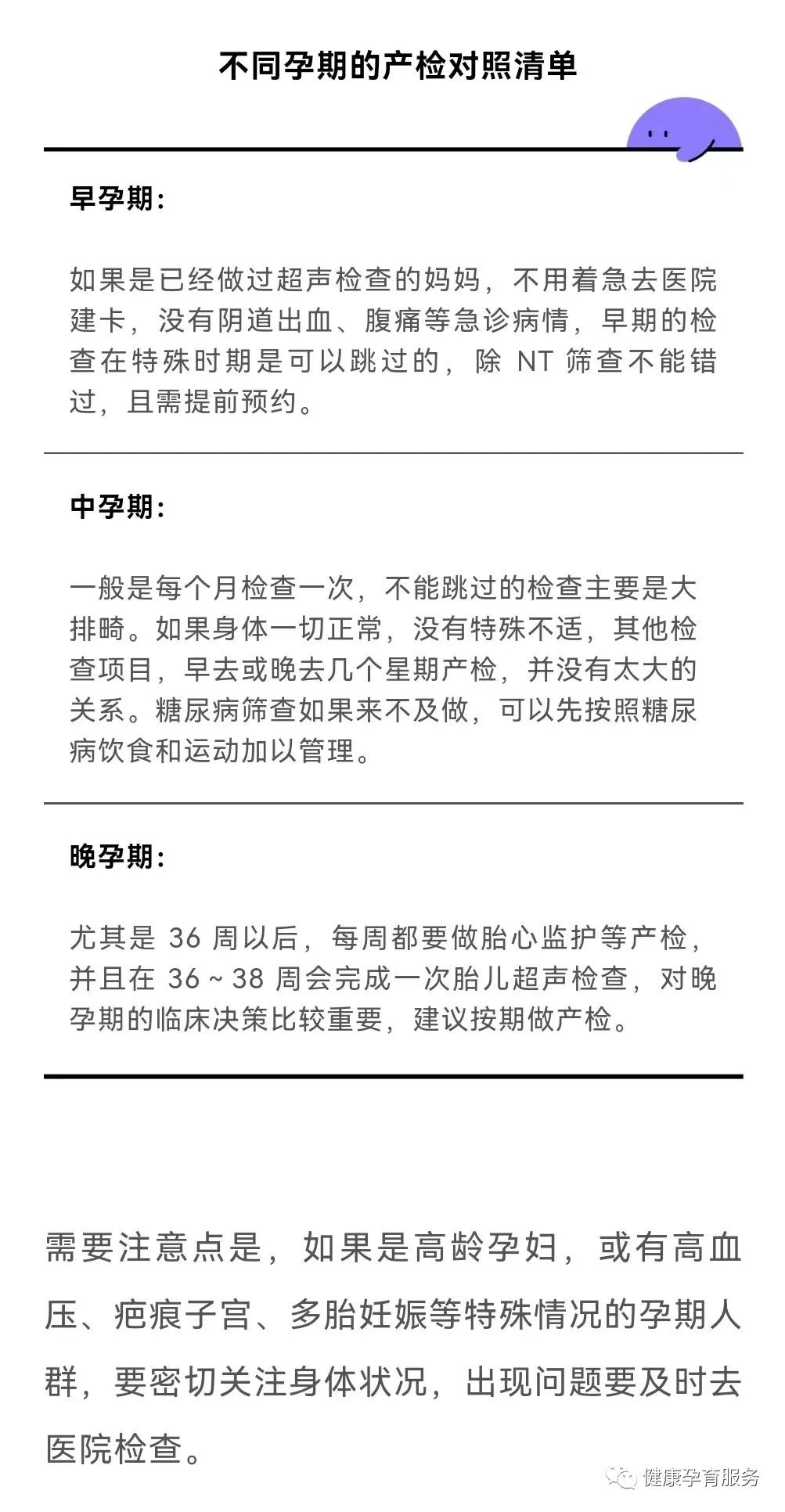 对于不同孕期的检查能否跳过和延后,我们也做了详细的介绍,妈妈们可以对比着看: