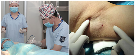 手术专家会根据患者的腋下皮纹走向,在皮肤褶皱处开一个微细小创口,仅3毫米,这样能达到术后恢复快,不留任何疤痕的效果;